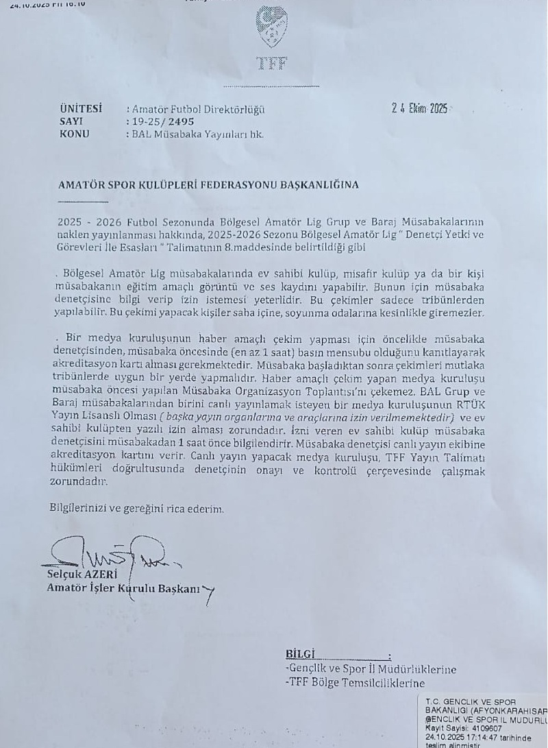 İlimizdeki yerel lig imaçlarının canlı yayını ile ilgili ASKF Başkanı Alişan AKGÜN açıklama yaptı. Türkiye Futbol federasyonu Amatör Futbol Direktörlüğü’nün 24.10.2025 tarih ve 19-25/2495 sayılı yazılarında Bölgesel Amatör Lig maçlarının yayınları hakkındaki yazıyı kulüplerle paylaşan AKGÜN,Yerel liglerin canlı yayınları ile ilgili açık bir hüküm bulunmamakla birlikte ilimizde oynanacak yerel lig maçlarının da Türkiye Futbol Federasyonu Yayın Talimatlarında belirtilen usul ve esaslara göre yapılması gerekmektedir. İlimizdeki TV ve sosyal medyadan yayın yapacaklara ve kulüplerimize bilgi için önemle duyurulur. İfadelerini kullandı.