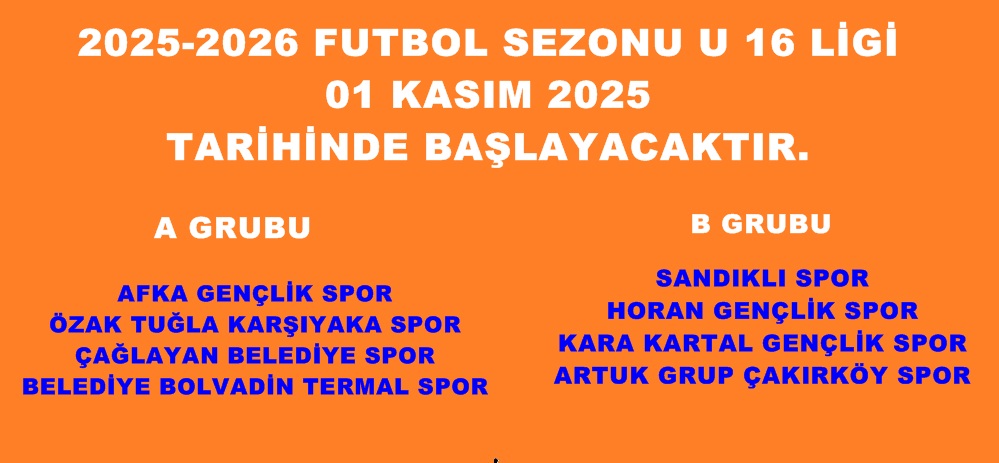 2025-2026 Futbol sezonunda U-16 ligi 8 takımın katılımı ile 2 grupta deplasmanlı ve çift devre lig usulü İle oynanacaktır. Grup maçları sonunda A1- B4 ile A2- B3 ile B1-A4 ile B2-A3 ile eleme maçları oynayacaktır, Eleme maçları sonunda (A1-B4 galibi-- B2-A3 galibi ile B1- A4 galibi ---A2-B3 galibi ile) yarı final maçları oynayacak,yarı final galipleri final maçı oynayarak Afyonkarahisar şampiyonu belirlenecektir.Şampiyon takım ilimizi Türkiye şampiyonasında temsil edecektir.