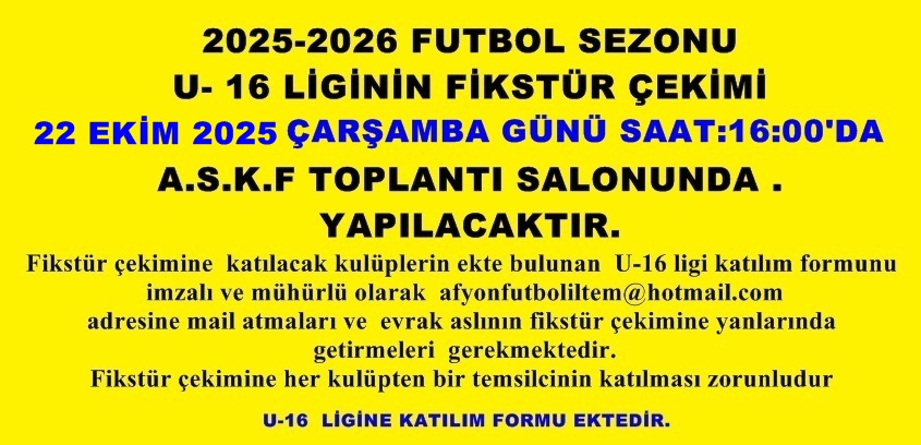 2025-2026 Futbol sezonu U- 16 liginin fikstür çekimi 22 Ekim 2025 Çarşamba günü saat 16:00’de ASKF toplantı salonunda yapılacaktır.